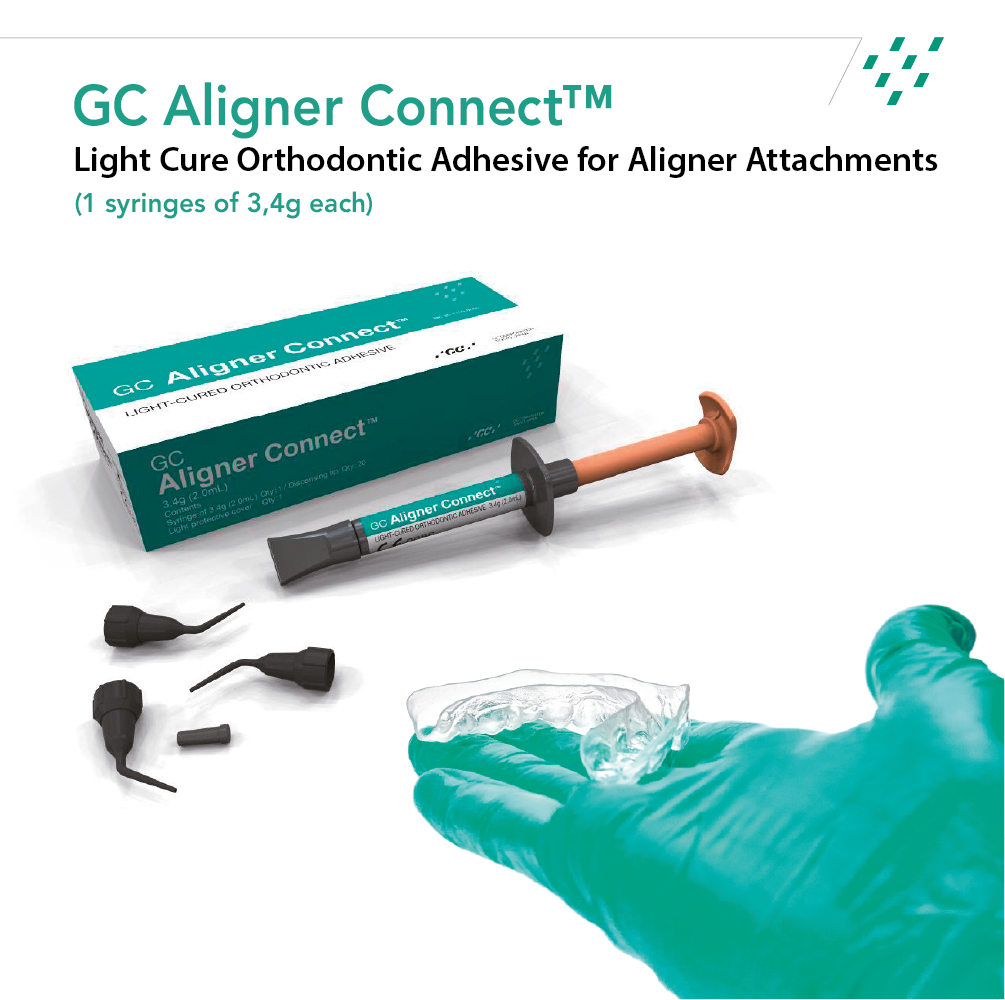 A first in the industry, GC Aligner Connect was specifically developed for orthodontic aligner attachments. GC Aligner Connect features enhanced aesthetics that imitate enamel color shades and high durabilty, which limits longterm wear or potential detachment during treatment. Adhesion is achieved with a ligh-cure bonding agent such as G-premio Bond, Ortho Solo or Assure.