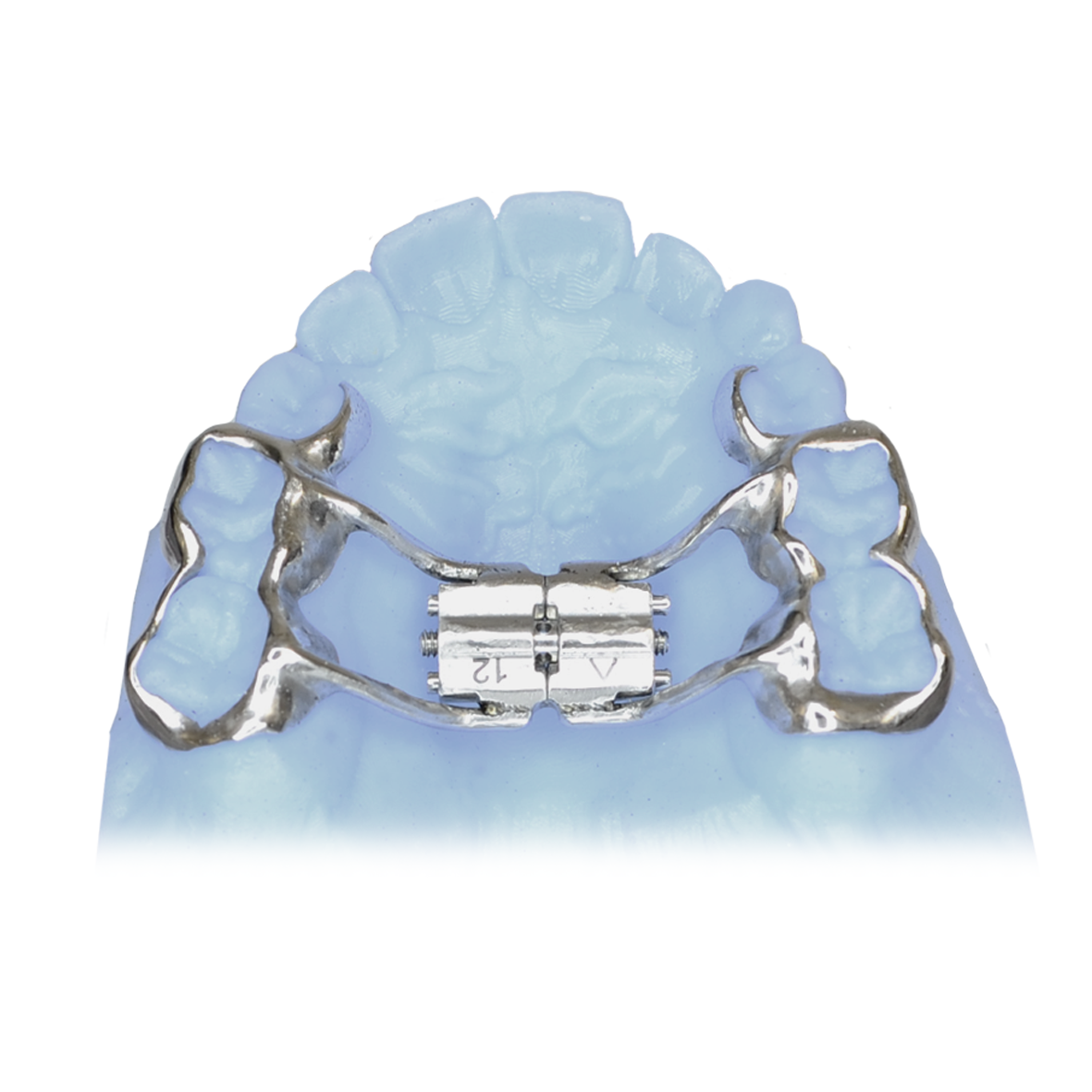 A rapid dilator, which works by tearing the labial suture and is used to dilate the upper dental arch skeletal body. It is usually anchored on 4 bands (first molars, first premolars, or possibly milk canines) It is advisable to perform a direct band test in the office. The bands are soldered to the metal arms of the Hyrax screw or possibly laser welded. The ideal expansion rate is 0.8-1 mm per day. The required dilation is overcompensated by 1-3 mm. The device is then left on for at least three months for retention. Can also be made with metal printing.